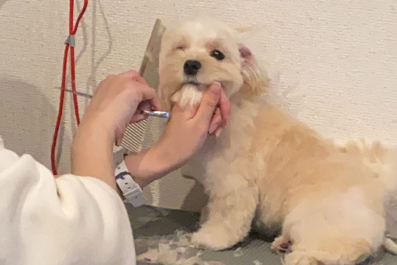 「初めての時は怖かったのか、壁にべったり引っ付いて少し震えていました。ただ、トリミングサロンのお姉さんが優しくて綺麗な方だったからか、すぐに慣れてしっぽをブンブン振って愛想を振りまいてました(笑)