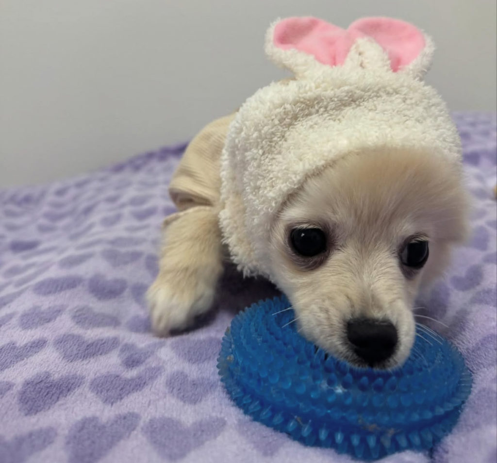 とにかく元気!イタズラっ子で、引越しして3日で壁やられちゃいました…。新しいベッドを買ってあげてもすぐに中の綿を出しちゃうイタズラっ子。食べるのが大好きで、おやつを見せると飛んでくる。こむぎの分まで奪いに行く時も!