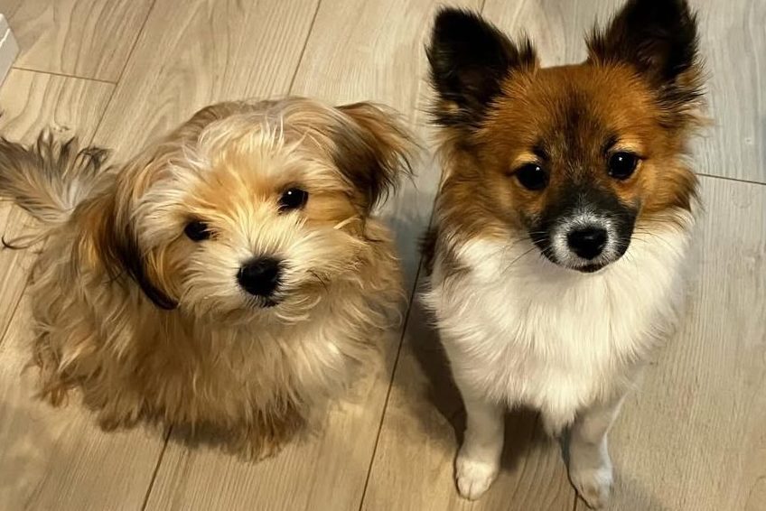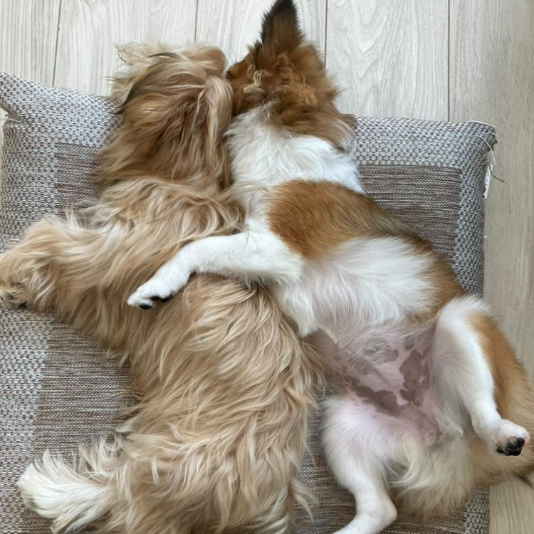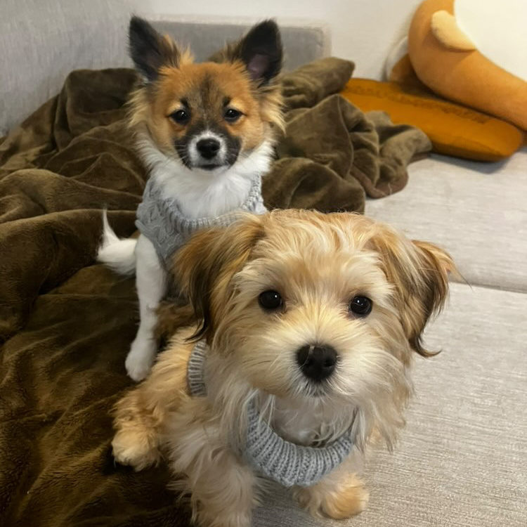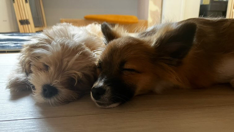 うめぼしちゃん(写真:右)は2025年5月22日生まれ0歳の女の子でおむすびくんのお姉ちゃん。人懐っこくて、犬見知りはしますが人は大好き!適度なふわふわ毛質が魅力のお姉ちゃん♡